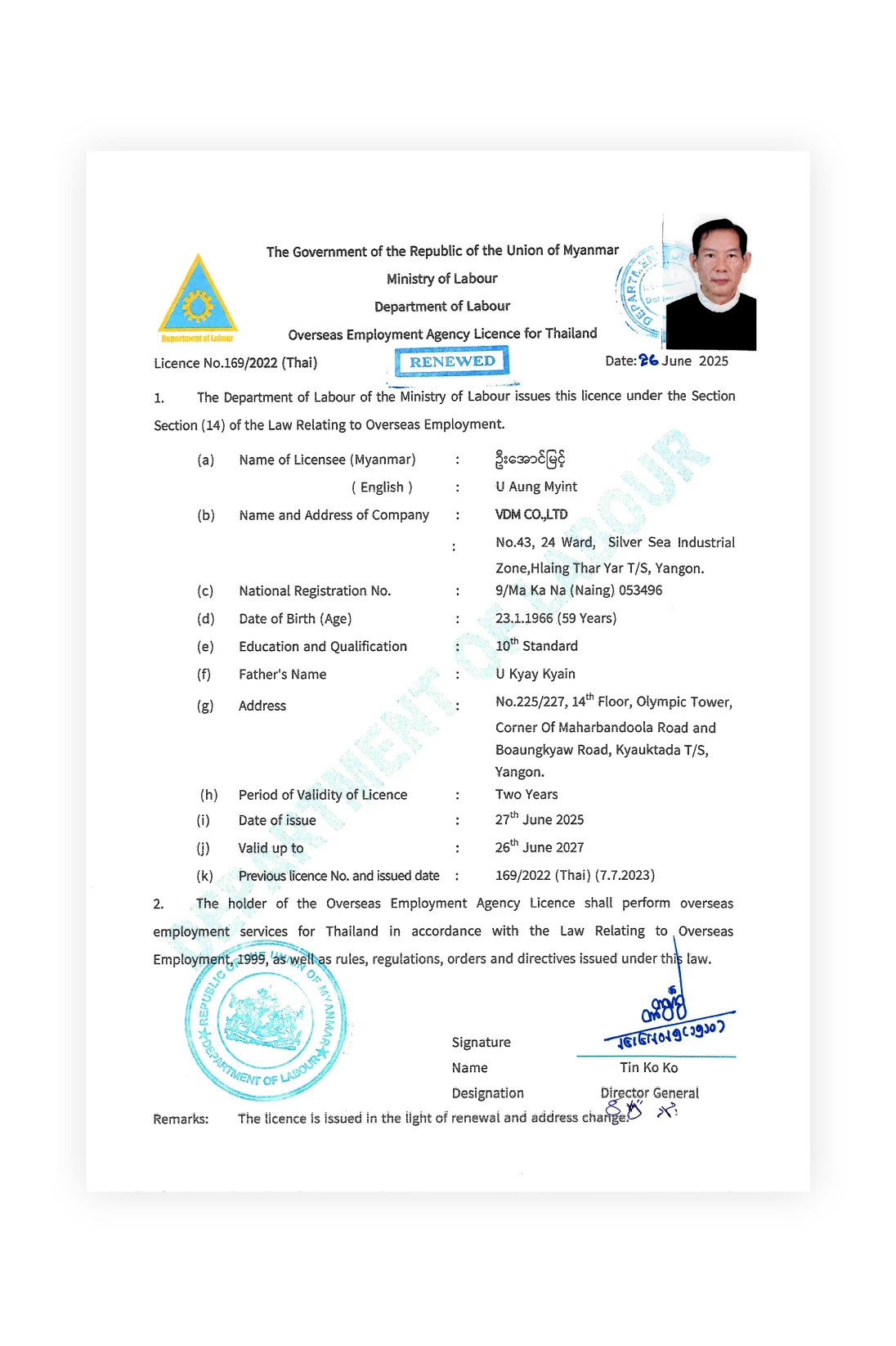 泰国第一人力资源集团有限公司, 先后通过ISO 9001:2015、ISO14001:2015 和 ISO 27001:2022国际标准化组织的认证。目前,我们在多种业务领域内,凭借招聘系统赢得了许多客户及大学企业雇主的广泛认可。无论是外劳招募系统、证件办理程序、还是工作进度计划、与贸易伙伴合作协商工作及跟进以及解决雇主和外劳的问题,都体现出了我们专业的服务和公司强大的组织协调能力。我们时刻准备好为您提供高效,可持续的、有效的服务并不断强化企业劳务管理体系的业务。
